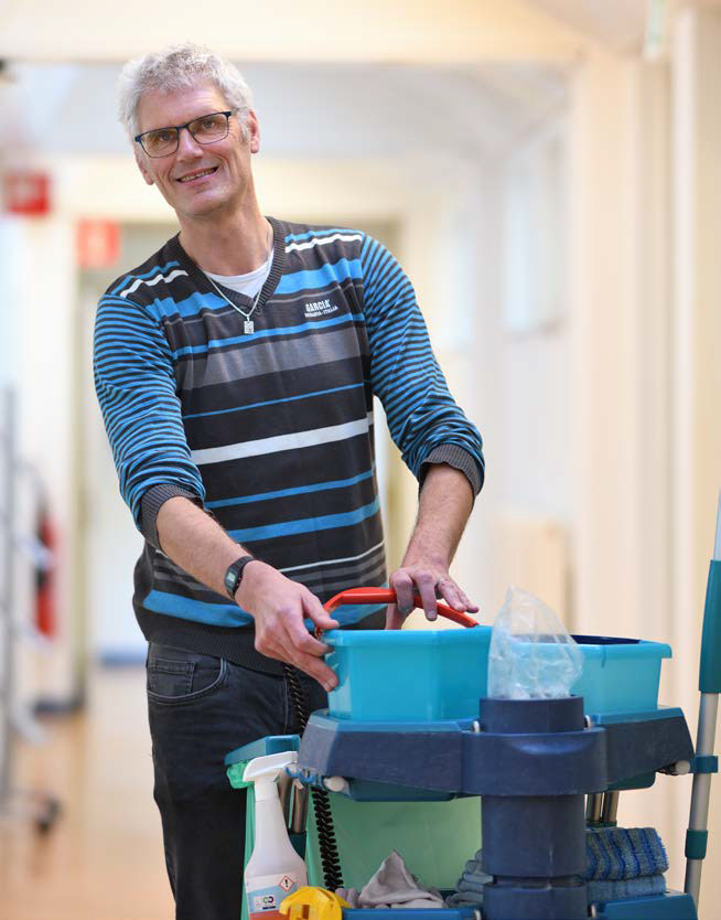 “Ik maak de toiletten hier schoon en stofzuig ‘s ochtends vroeg de kantoren. En ik heb nu geleerd hoe ik water test op legionella. Daardoor kom ik wat meer op De Trans woningen in Nooitgedacht.” Tom kwam voor het eerst in aanraking met De Trans als cliënt bij de dagbesteding, maar is inmiddels één van de vaste medewerkers op het hoofdkantoor van De Trans in Rolde. “Schoonmaakwerk is voor mij een fijne routine. Dat je niet direct ziet dat ik een beperking heb, is fijn maar ook wel lastig omdat mensen soms meer van mij verwachten.”
